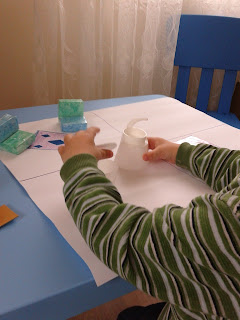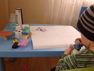 Bir beyaz kartonu 4 e böldük; hangi odalar olduğunu söyledim Minik adamıma tek tek..Karışık vaziyetteki eşyaları yerleştirdi MİNİK’im yerlerine…