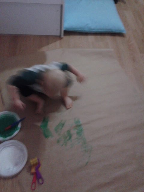 Merhabaaalar efendiiimmm :)) Annesinin dersleri ,sınavları, Minik adamın öksürükleri,ateşleri derken uzun zamandır ayrı kaldık blogumuzdan… Neyse ki hastalıklarımız büyük orandan azaldı ve sahalara geri döndük ! :)) Bugün ne yapsak , ne etsek,ne oynasak diye ; ETKİNLİK KİTABImızı kurcalarken de ;işte bu oyunu gördüm! AYAK BASKISI ! :))) Fikre bayıldım ama ,’banyo oyunu’ olarak uygulamak üzere erteleriz demiştim.. Derken ; Minik , zulama sakladığım kraft kağıtlarımı ele geçirmiş bir vaziyette karşıma gelince ;kendiliğinden bir araya gelen bu muhteşem ikiliye karşı koyamadım ! :)) Hemen; banyomuzun önündeki paspası ortadan kaldırıp ; yere bu koooskocaman kraft kağıdı serdim.. Parmak boyalarımızı tabaklara sıkarak hazırladım..Süngerler, fırçalar da tamam.. Çoraplar çıkartıldı, kollar sıvandıı …ve SAVAAAŞA HAZIRIIIZ ! :)) Önce ayaklarımızı boyalarla boyayıp,kağıdın üzerinde yürüdük,hopladık zıpladık 🙂