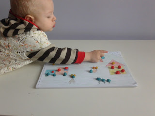 Bulduğumuz şekillerin üzerlerine,minik yuvarlak hamurlarımızdan koyup İŞARETLEMİŞ oluyoruz.(her şekil için farklı renk hazırladım,ayırt edici olsun diye  ve bir not daha,bu oyun hamuru ile işaretleme tekniğini de görsellerde gezinirken öğrenmiştim:)=))