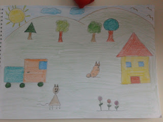 Resimdeki objeler belli şekillerden oluşuyor..Kare ev,kare pencereler, üçgen çatı, üçgen kulaklı ,daire kuyruklu tavşan gibi..