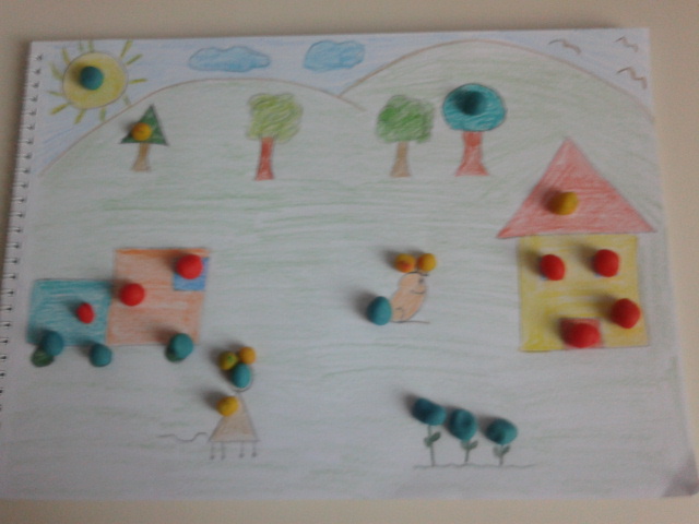 Bulduğumuz şekillerin üzerlerine,minik yuvarlak hamurlarımızdan koyup İŞARETLEMİŞ oluyoruz.(her şekil için farklı renk hazırladım,ayırt edici olsun diye ve bir not daha,bu oyun hamuru ile işaretleme tekniğini de görsellerde gezinirken öğrenmiştim:)=))