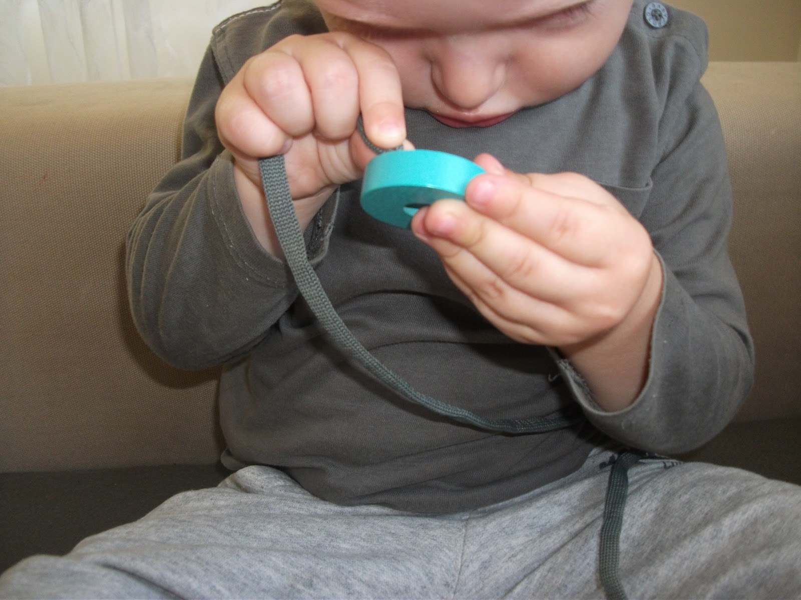 Bu oyunda Minik Oyuncu ,büyük bir heves ve dikkatle ipi delikten sokuyor ama arkasında ipi çekip ,dizme işini henüz tek başına beceremiyor 🙂 belki birkaç oyundan sonra öğrenebilr 🙂