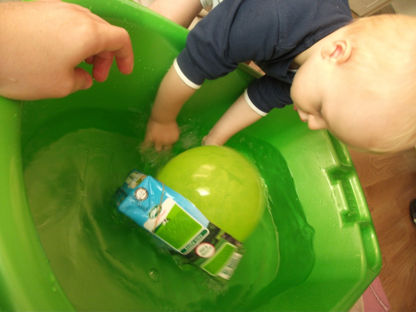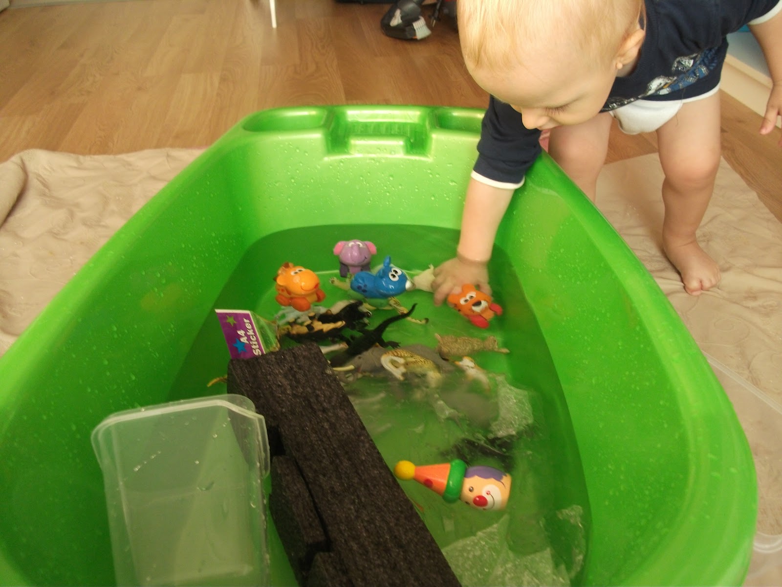 Minik buna şaşırınca,eline geçen ,yakındaki tüm oyuncakları suya boşalttı ve deneye kendi devam etti..